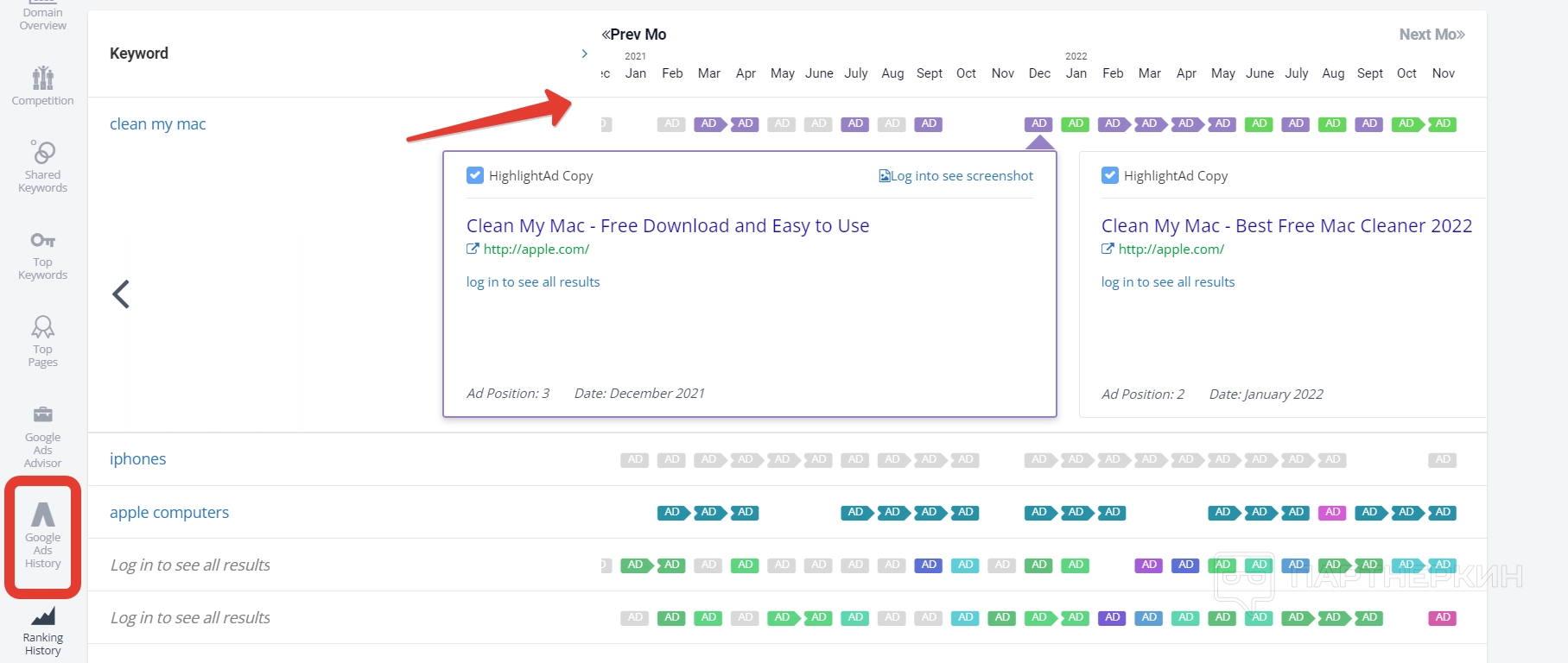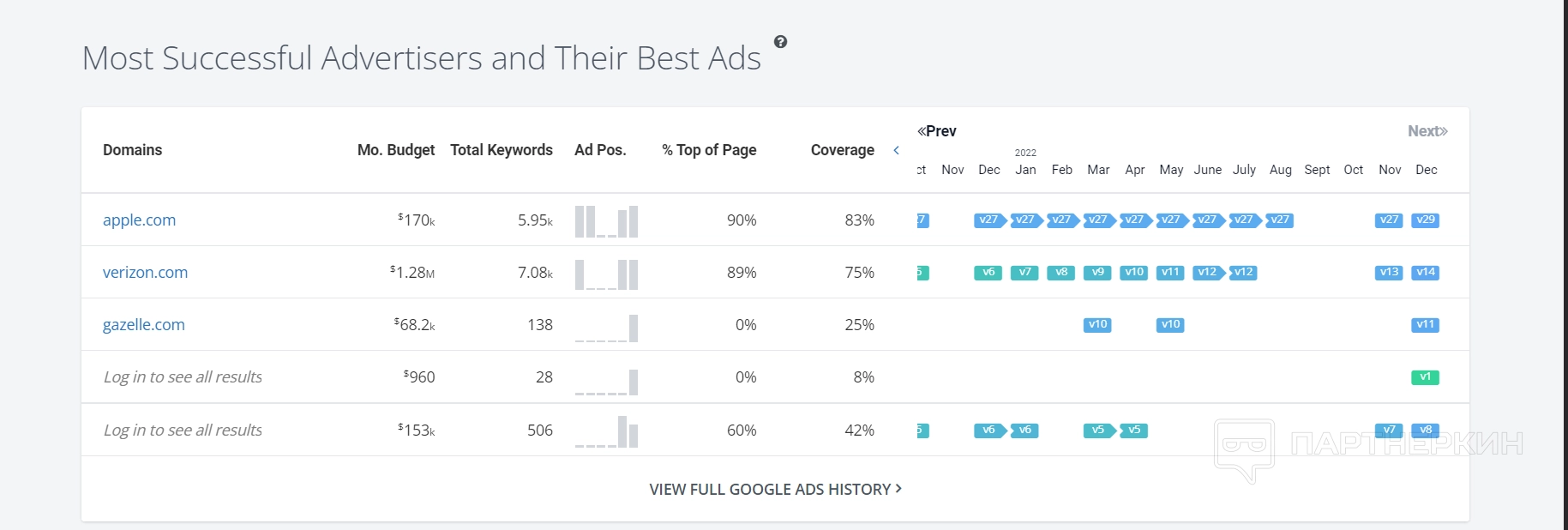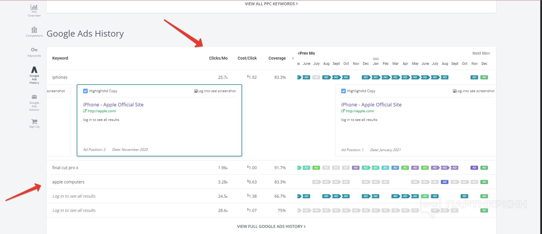 История рекламы в Google Ads — здесь можно посмотреть все рекламные кампании, которые запускались по данному домену. Причем исторические данные сохраняются — можно посмотреть информацию даже за прошлый год.