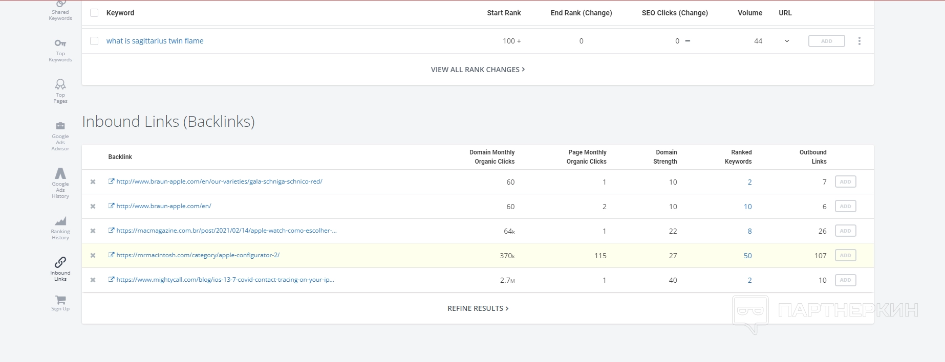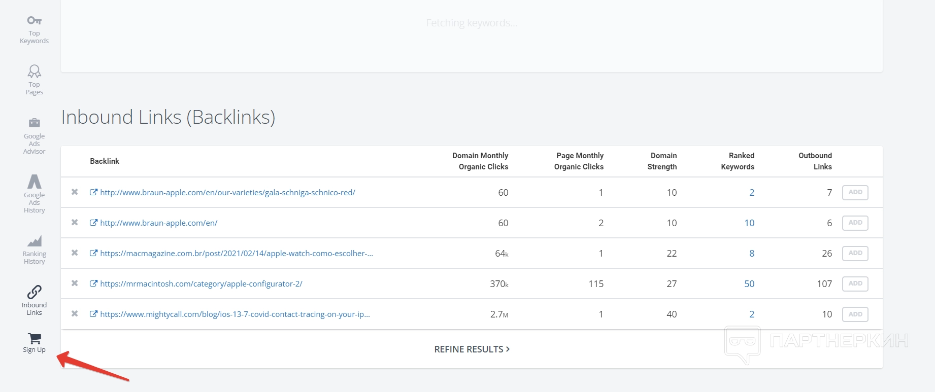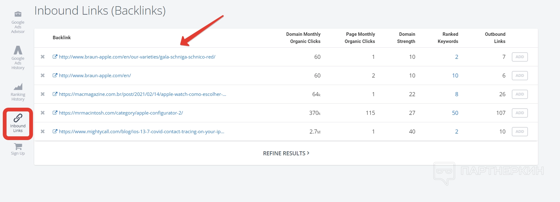Обратные ссылки — в этом разделе показывают, какие сайты ссылаются на домен, который анализируется на сервисе. К примеру, на Apple чаще ссылается сайт Braun-apple:
