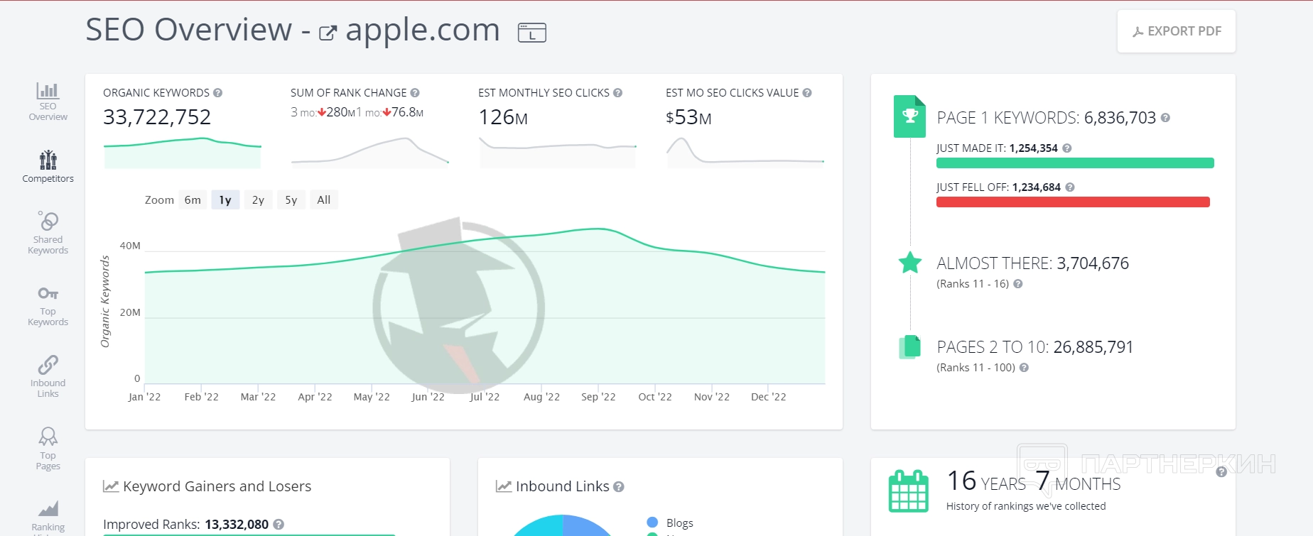 Обзор Seo — как и в предыдущем примере, в этом пункте разбираются все основные данные по ключевым словам. В кратком графике система показывает все органические ключевые слова, сумму изменений рангов, расчетное количество seo-кликов и стоимость кликов. Если кликнуть на каждый из графиков, то откроется его более масштабная версия — в ней можно посмотреть данные за последние 6 месяцев, год, два года, пять лет и за весь период.