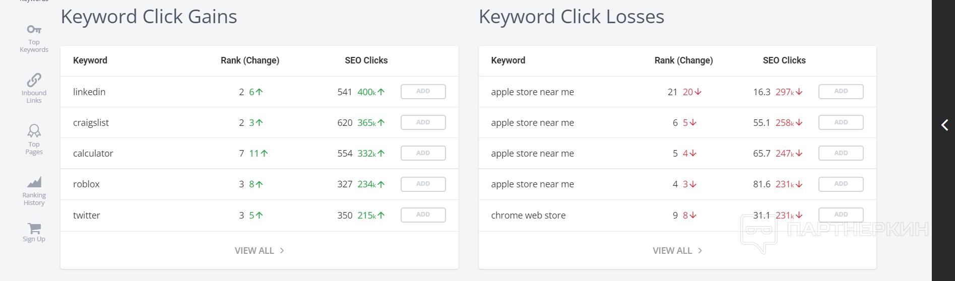 В этом же пункте отображаются и другие данные — приросты и потери кликов по ключевому слову.