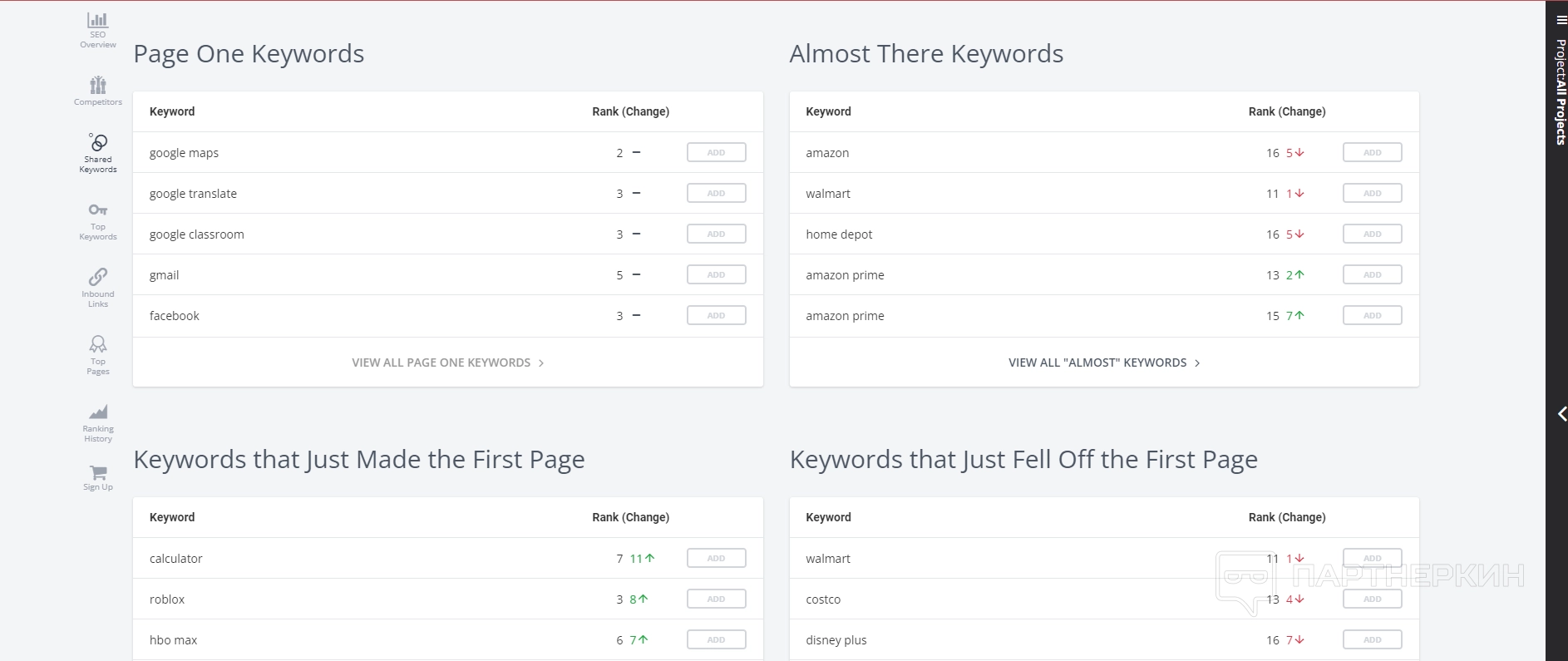 Важно знать — чтобы добавить новые слова в списки или группы, можно делать это вручную и просто вставлять список слов. Но также можно добавлять в проект все ключевые слова, которые заинтересовали пользователя в процессе анализа — например, посмотреть похожие ключевые слова в обзоре и через кнопку «ADD» добавить их в список. Кнопка появляется после добавления проекта.
