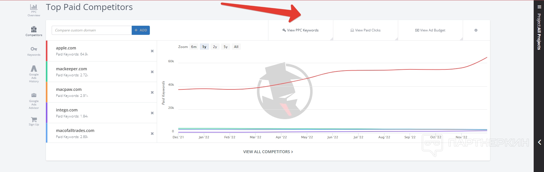 Самые высокооплачиваемые конкуренты — в пункте подбиваются данные о конкурентах, которые больше всего вкладываются в контекстную рекламу. Здесь можно отобразить сами данные о конкурентах и прогрессии их рейтинга, а также просмотреть все платные клики и объем рекламного бюджета.