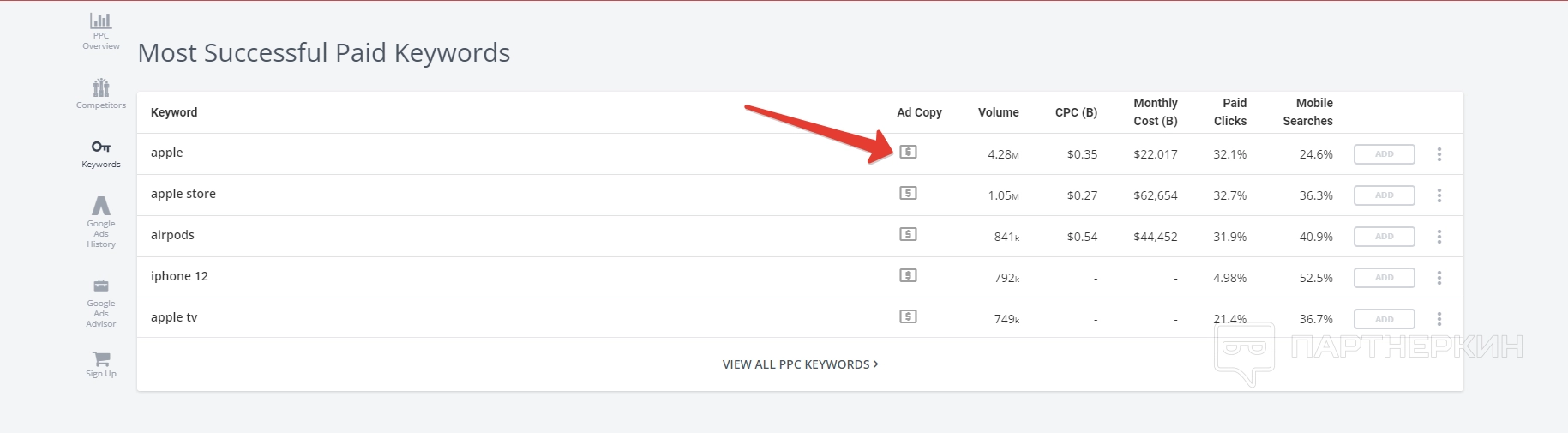 Самые успешные платные ключевые слова — в этом пункте собирается информация по самым топовым словам, которые оплачивались. В таблице можно посмотреть сами объявления, в которых использовались эти ключи, если тапнуть по значку доллара: