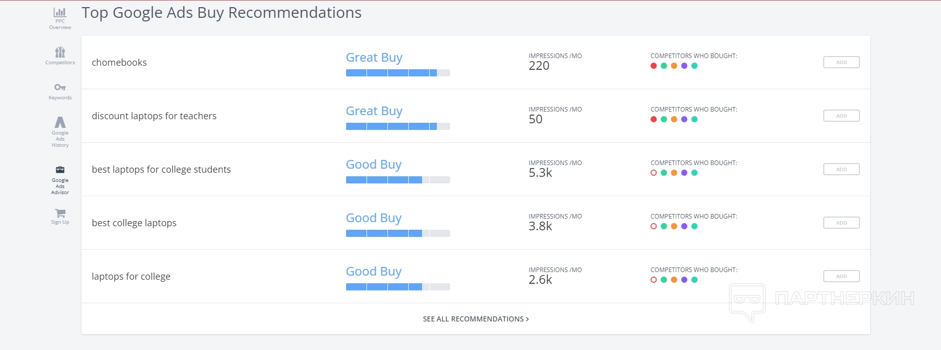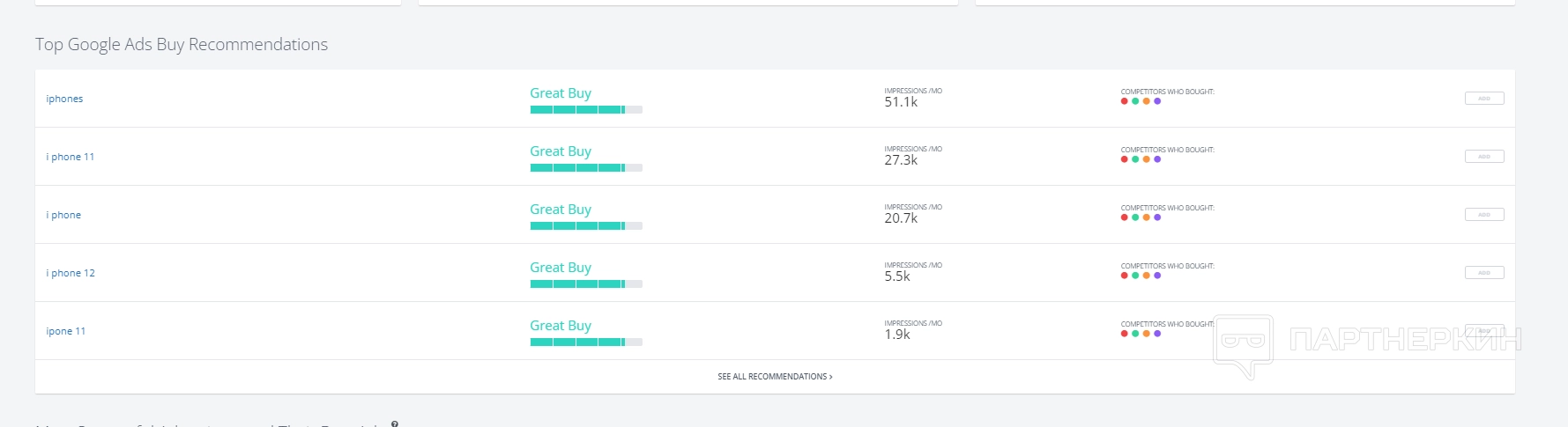 Лучшие рекомендации Google по покупке — в этом пункте собираются рекомендации от Google Ads по покупке ключевых слов. Система отображается средний рейтинг фразы, а также показывает, сколько раз в месяц ее используют для поиска, и какие конкуренты уже купили ее. С помощью этой таблички можно искать новые ключевики, чтобы лучше продвигать домен.
