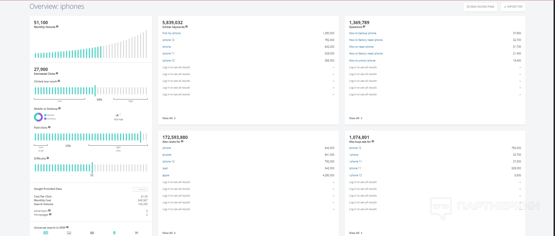 Обзор — здесь подбиваются суммарные данные по ключевому слову. Например, ежемесячный объем ключевика, примерное количество кликов, график с соотношением поиска на десктопе и мобильном телефоне, платные клики, сложность ранжирования, примерная цена за клик, стоимость в месяц и количество запросов. Кроме того, система показывает, какие данные чаще фигурируют в объявлениях с подобным ключом — аудио, видео, текст, геолокация или товары. Все эти данные находятся в колонке слева.