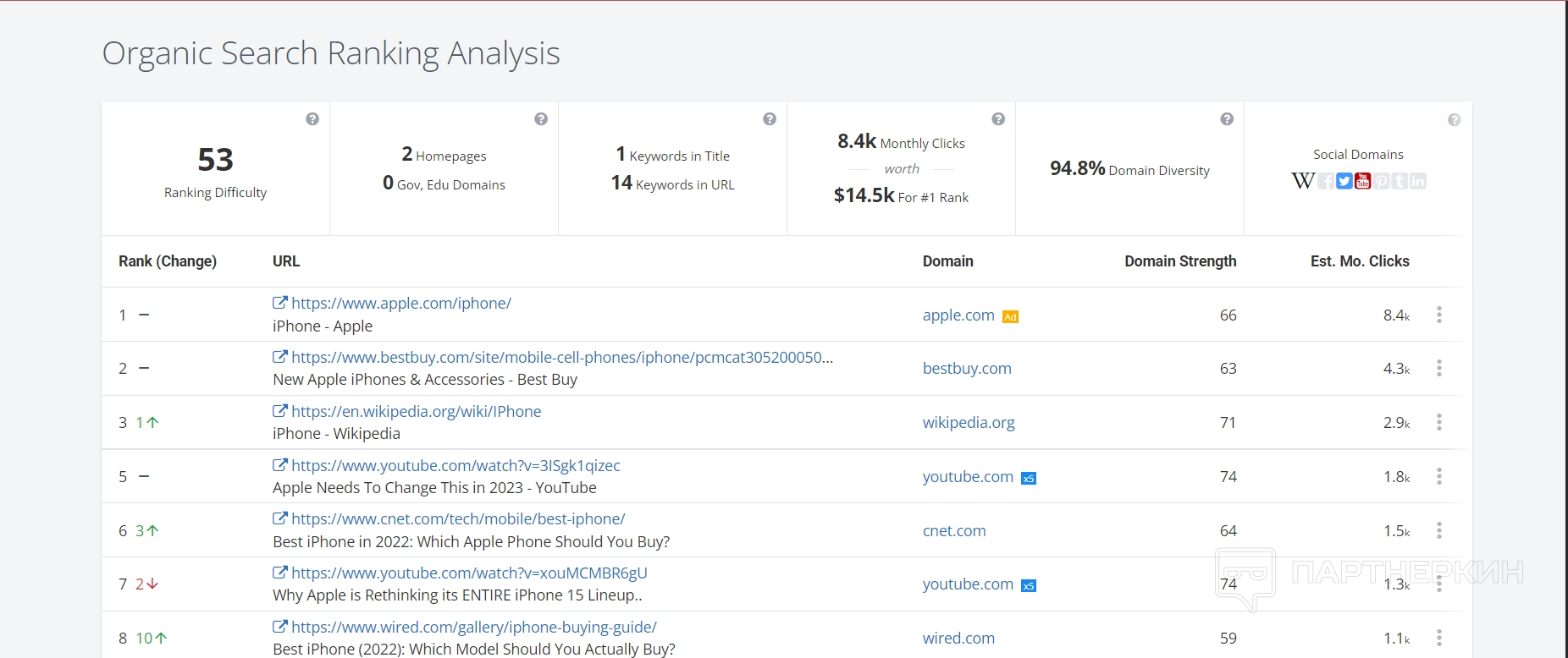 Анализ ранжирования в органическом поиске — в этой характеристике подбиваются данные по сложности ключевика, домашним, правительственным и университетским доменам, которые используют этот ключ, наличию ключа в заголовке на странице или в урле, количеству кликов, разнообразию доменов и по количеству социальных доменов.
