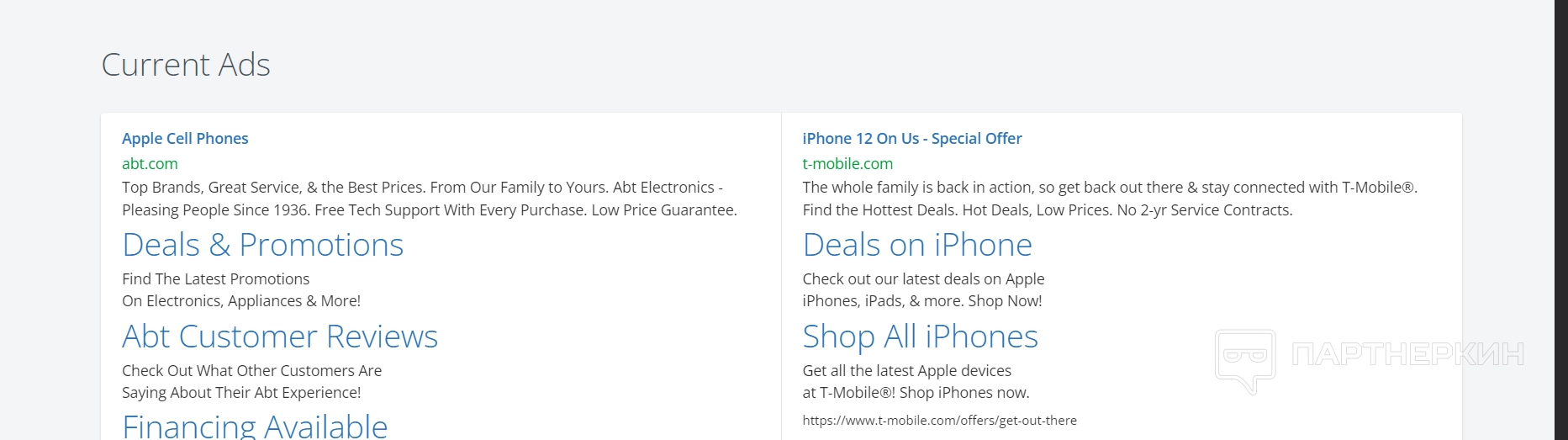 Текущие объявления — выводятся все популярные объявления с данным ключом, а также показывается, на какой именно домен они ссылаются.