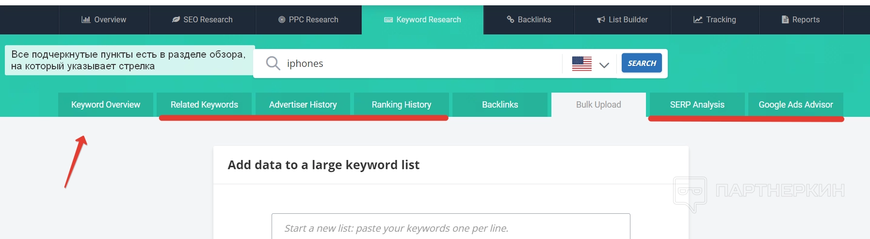 Обзор ключевых слов — для работы с этим пунктом нужно ввести ключевую фразу. По умолчанию вписывается главный ключ по домену, который анализируется. После запуска анализа открываются шесть характеристик.