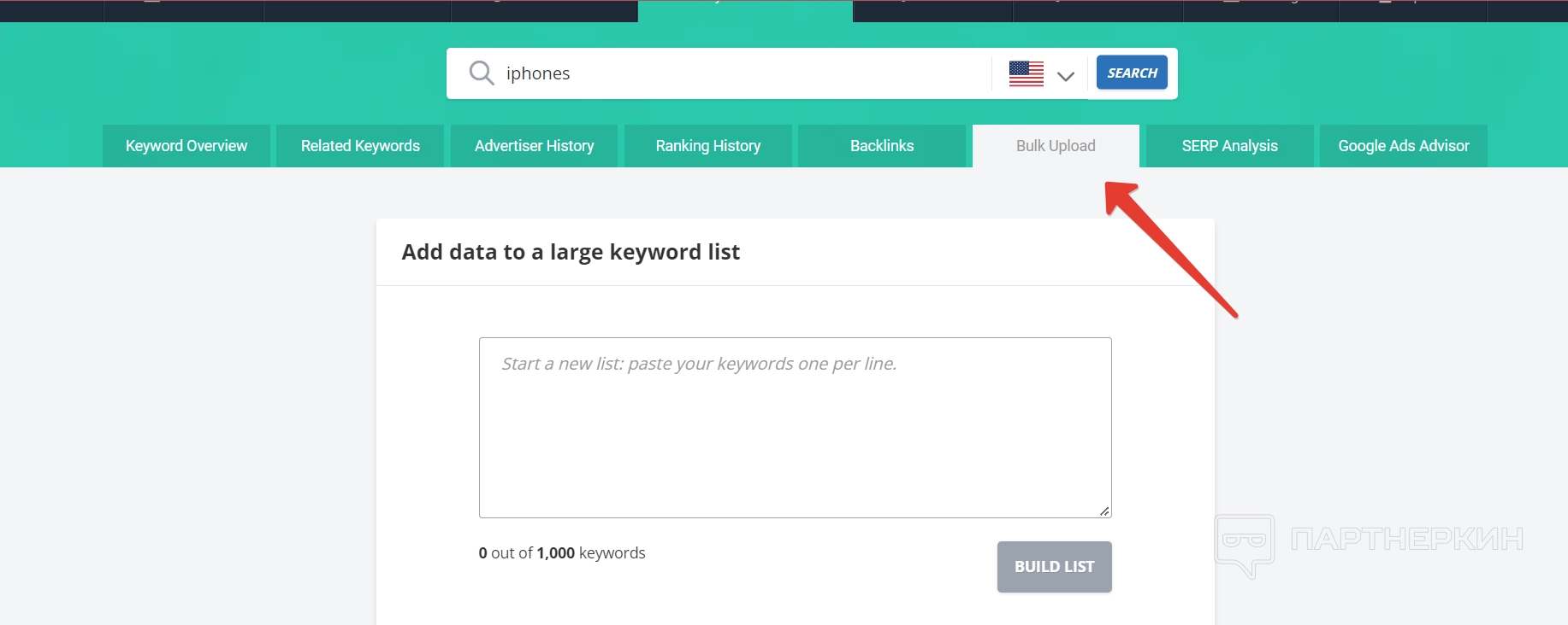 Массовые загрузки — это интересный пункт, в котором можно загрузить собственный список ключевых слов, провести их анализ, отсортировать нерабочие и экспортировать список для дальнейшего использования.