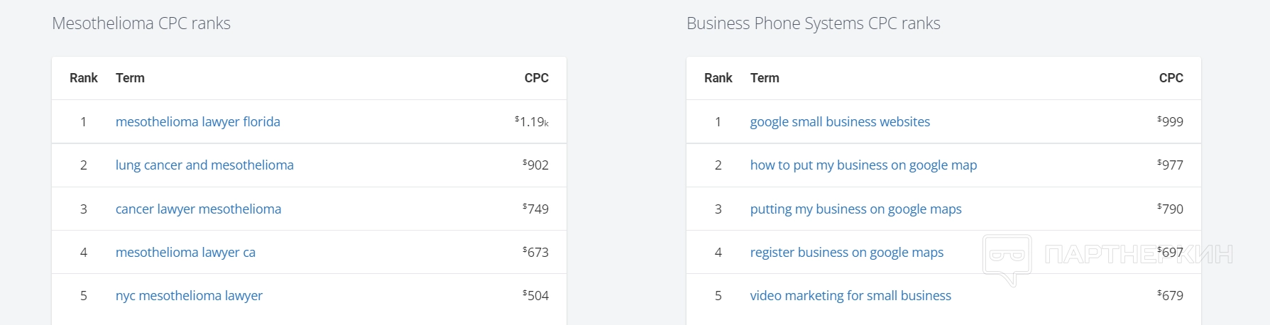 - ключевые слова с самой высокой ценой за клик — указывается само ключевое слово, а также стоимость за один клик;