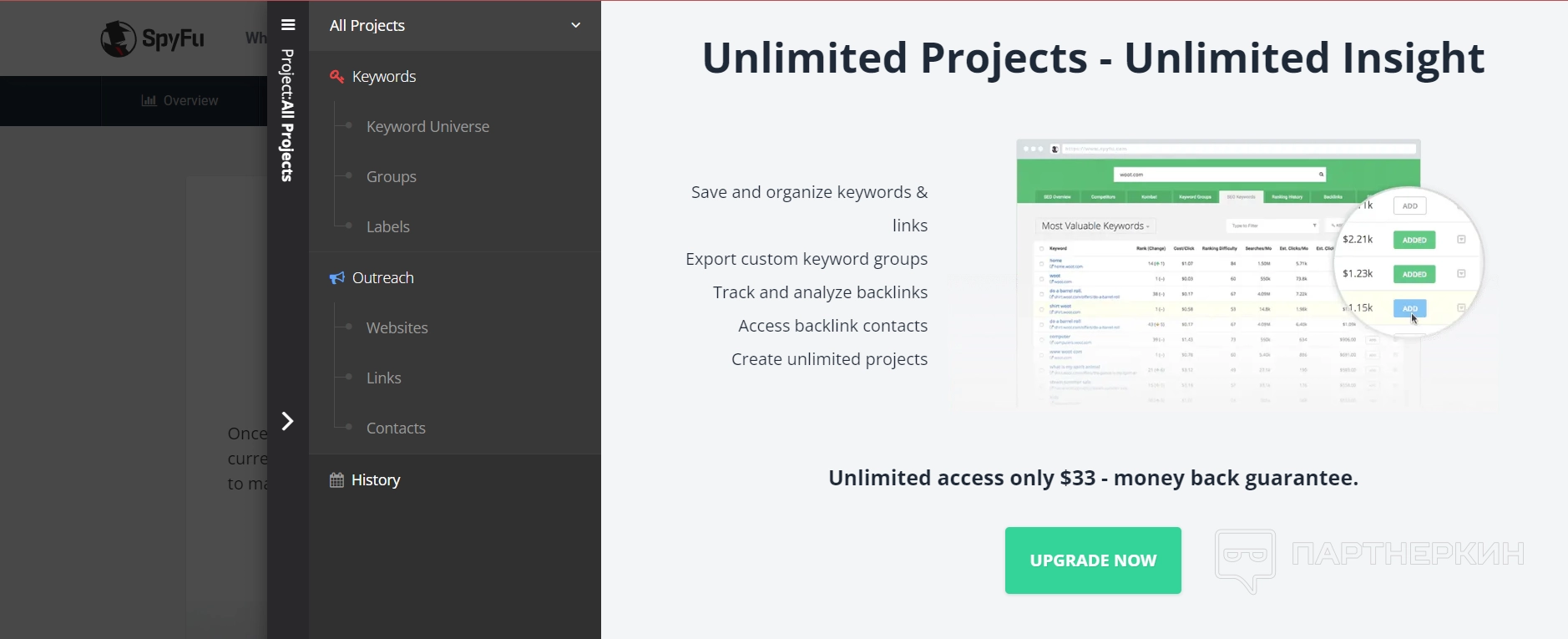 Анализ выше был проведен без регистрации на сервисе — это значит, что можно делать проверку или анализ бесплатно. Но при этом пользователь получает лишь часть данных. Например, в отчете по ключевым словам можно посмотреть только первые 3-4 слова — остальные открываются только после оплаты тарифа. Давайте рассмотрим все возможности, которые открывает подписка на сервис:
