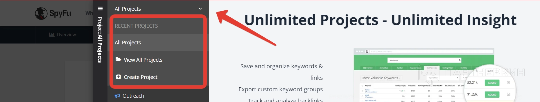 В меню находится четыре раздела — проекты, ключи, охваты и история.
