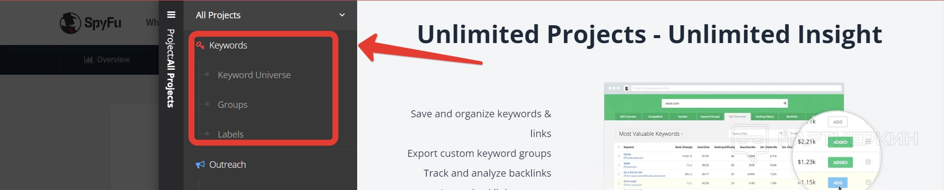 Ключи — каждому проекту соответствует определенные списки с ключевыми словами. В этом разделе их можно посмотреть, создать новый список, сгруппировать или добавить к ним лейблы, чтобы отметить категорию.