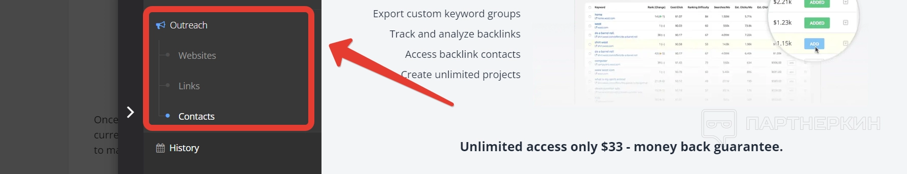 Но в разделе есть дополнительная функция — это автоматический поиск контактов по обратным ссылкам. Принцип такой — пользователь выбирает лучшие обратные ссылки для себя, запускает новый проект и получает все способы связи с владельцами этих сайтов. Не придется собирать данные самостоятельно или хранить их в заметках — система даст один подробный список, которым можно пользоваться.