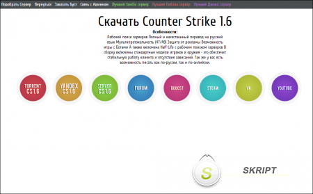 Простенькая страница Скачать CS 1.6 в стиле минимализма , обычное меню на тёмном фоне , анимированые в разных цветах кнопки скачать , оформить контент можно на любой вкус , сделать контент более объёмным вставив картинку вашей cs , и выделить буквы особым цветом. Шаблон оригинальный , так же его не найти в интернете.