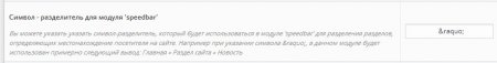 24. В настройки скрипта добавлена возможность назначение символа - разделителя, для модуля 'speedbar' (хлебные крошки). Данный символ будет использоваться при выводе навигации данного модуля, разделяя разделы сайта. Тем самым вы можете указать любой собственный разделитель, вместо постоянно используемого ранее символа "»".