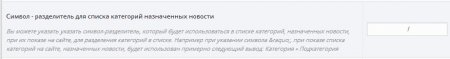 25. В настройки скрипта добавлена возможность назначение символа - разделителя, для списка категорий, назначенных новости. Данный символ будет использоваться при выводе списка категорий при показе новостей на сайте, разделяя назначенные категории. Тем самым вы можете указать любой собственный разделитель, вместо постоянно используемого ранее символа "»".